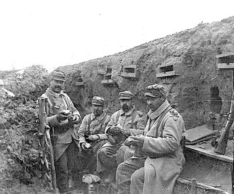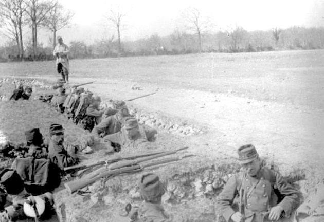 En novembre 1914, dans l'impossibilité de vaincre, les deux armées adverses sont immobilisées face à face sur une ligne continue de 780 km, allant de la mer du Nord à la Suisse. Ainsi la guerre de manoeuvre se transforme-t-elle en guerre de siège, de positions et de tranchées.