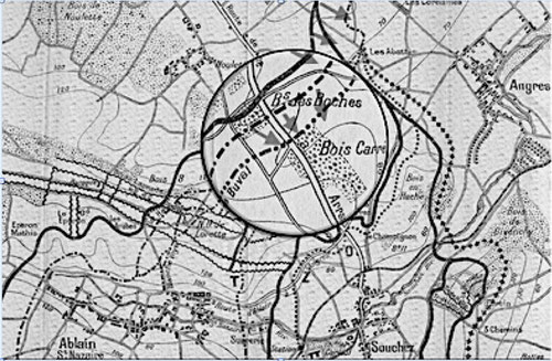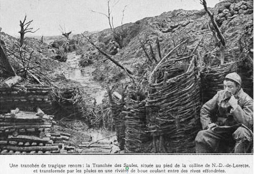 Le soir, le 5ème bataillon relève le 158ème régiment d'infanterie dans la tranchée des Saules et des Parados, la route de Béthune à Arras. Violent bombardement par des canons de 210 sur nos positions, que les Allemands connaissent bien en raison de leur situation en pente et perpendiculaire à leur ligne générale. Les 17ème et 18ème compagnies sont très fortement éprouvées. A 15 h, les Allemands prononcent une attaque sur le point de jonction de ces 2 compagnies; grâce à la courageuse résistance et le sang-froid du sergent Carrié, de l'adjudant Baron et des 1ème et 2ème sections de la 18ème compagnie, cette attaque est clouée sur place et notre ligne reste intacte.