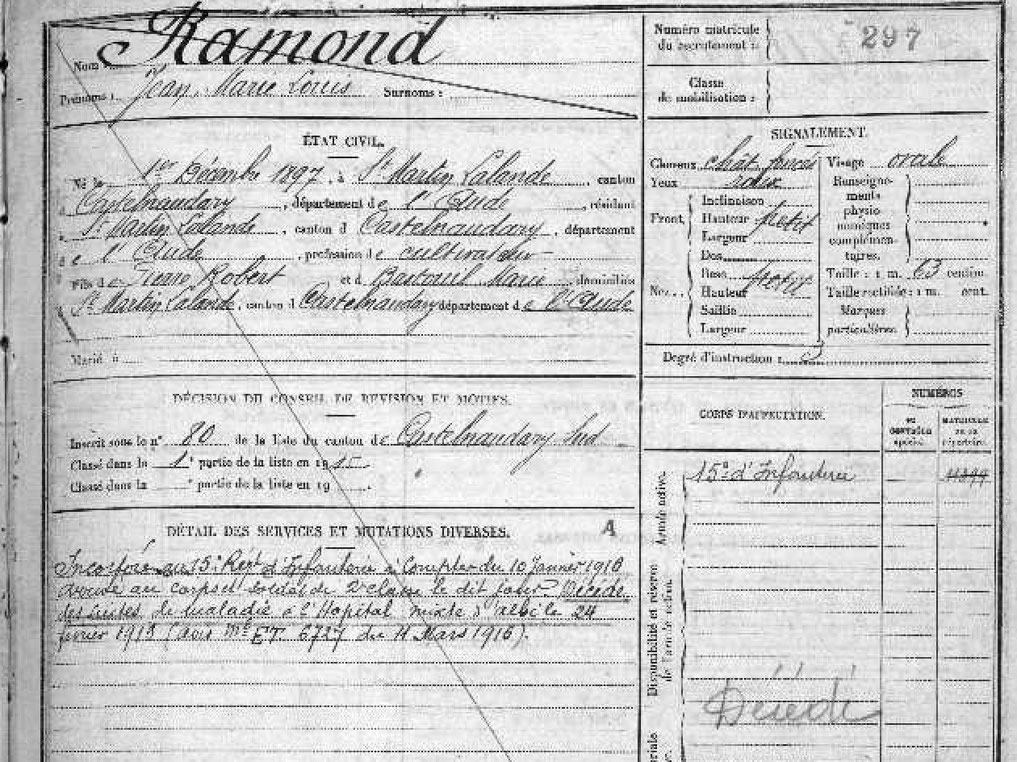 Jean-Marie Louis passe devant le conseil de révision à Castelnaudary, en mai 1915. Son numéro matricule est le 297 / Carcassonne. Il est déclaré «bon pour le service».