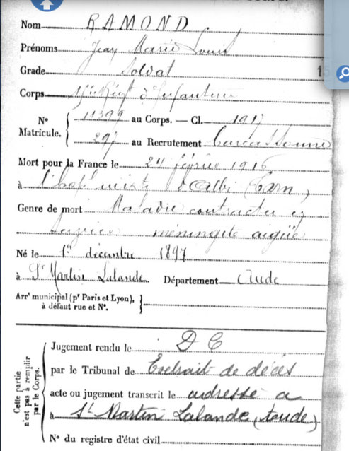 Son décès est transcris sur le registre d’état-civil de la commune de Saint Martin Lalande à la fin du mois de février 1916.